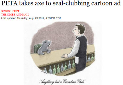 The animal advocacy organization will stop distributing a New Yorker-style cartoon protesting the annual Canadian seal hunt after the North American distributor of Canadian Club whisky failed to see the humour in the drawing of a seal requesting a drink from a bartender with: "Anything but a Canadian Club." On the back of the postcard is a photograph of a hunter about to club a seal. Globe and Mail There is no pain-numbing clubbing before the animal is bled to death in ritual Islamic slaughter. PETA is looking for animal suffering in all the wrong places. Muslim community calls PQ alarmist over halal meatMembers of the Muslim community, however, say the PQ has mischaracterized the issue and is being unduly alarmist. The only difference between halal meat and the meat sold for general consumption, they say, is that the animals are first blessed before being slaughtered – in the same manner that other animals are slaughtered in the province. Globe and Mail, October 15, 2012 NOT TRUE! On the Ritual Slaughter of Animals. Bernard Payeur