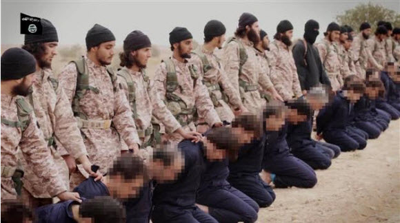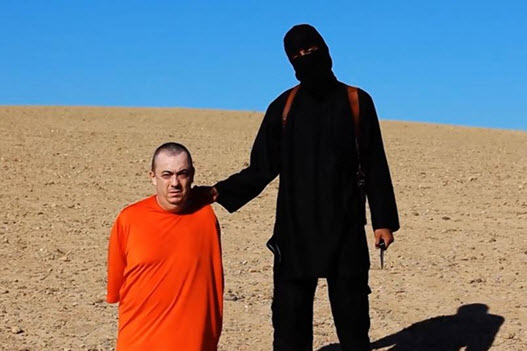 An image grab from propaganda video released on November 16, 2014 by al-Furqan Media allegedly shows members of the ISIL jihadists preparing the simultaneous beheadings of at least 15 men described as Syrian military personnel. AFP Photo When Muhammad championed the beheading of his enemies, holy warriors used swords. Today, it’s a combat knife or something similar that keeps that tradition alive. Unlike an expertly wielded sword, it is totally inadequate to the task, unless your goal is to prolong the horror and the agony of such a method of execution. A holy warrior in the service of the Islamic State, with the power granted to him by the Koran, about to behead British aid worker Allan Henning with the same type of knife used to decapitate the Syrian military personnel in the AFP photo.