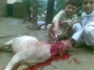 What it’s like for a human being to be killed in the manner demonstrated by the two boys. The Ottawa Citizen’s description of the execution of Nicholas Berg by Abu Musab al-Zarqawi (al-Qaeda’s top man in Iraq at the time) on May 7, 2004: Zarqawi literally hacked and sawed with his knife the neck of the young twenty-six year-old idealist from Pennsylvania while he screamed in agony. In the words of Dan Garner writing in the Ottawa Citizen, Zarqawi “sawed back and forth as if he were cutting a thick rope. Berg screamed and screamed and screamed. Zarqawi kept sawing back and forth, back and forth, cutting on this side, cutting on that. Finally, Nicholas Berg’s head left his body. Zarqawi clutched it by the hair and raised it to the camera as he and his men shouted “Allahu Akbar! God is Great, God is Great.” The ritual slaughter of animals by pilgrims at the Hajj is today largely outsourced, meaning that the ritual has been largely compromised. A testament to its irrationality. Usually, the post office is where you send mail or pay your bills. In Saudi Arabia during the hajj, it’s where you pay for your animal sacrifice. It costs 460 riyals, or about $120, to have a sheep slaughtered. The sacrifice, known as the hadi, is incumbent on all pilgrims, who must donate at least two-thirds of the meat to the poor. Modern pilgrims usually have a slaughterhouse near Mecca do this for them, via the local post office. How do you know your animal was sacrificed? By text message, of course. New York Times, Postcards from the Hajj, Diaa Hadid, Sept 10, 2016 That compromised includes not garnishing the animal, as God commanded, before a pilgrim, not an employee of a slaughterhouse, cuts its throat. 5:97 Allah has made the Ka’ba, the Sacred House, a foundation of religion for all mankind, together with the Sacred Month and the sacrificial offerings and their garlands, so that you may know that Allah knows what is in the heavens and on the earth, and that Allah knows everything very well. How it’s actually done at the Hajj: [In] sweaty slaughterhouse on the edge of Mecca: Men in stained robes hauled flailing sheep into the building. One man dragged his prey by its leg, and another carried one of the animals on his back. New York Times, Postcards from the Hajj, Diaa Hadid, Sept 10, 2016 Western slaughterhouses that have not been instructed by their governments to torture animals to death when asked, like in Canada, use a stun gun to render the animal unconscious before being bled to death. The pagans at their Hajj used to set animals free as a tribute to their gods. Narrated Said bin Al-Musaiyab: As-Saiba was an animal which they (i.e. infidels) used to set free in the names of their gods so that it would not be used for carrying anything. Abu Huraira said, "The Prophet said, 'I saw Amr bin Amir bin Luhai Al-Khuzai dragging his intestines in the (Hell) Fire, for he was the first man who started the custom of releasing animals (for the sake of false gods).'" Bukhari 76.723 Islam tortures animals to death as a tribute to their deity. Islam is very much a synthesis of Jewish beliefs and pagan traditions, many of which it has perverted with cruelty dominating where once there was tolerance, kindness and joy, as Amir bin Luhai Al-Khuzai dragging his intestines in Hell will attest.