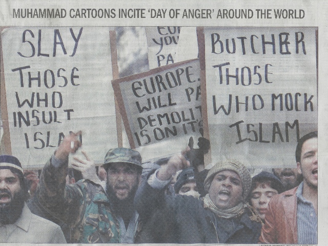Muslim protesters march towards the Danish embassy in London