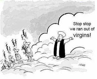 The only cartoon published by Charlie Hebdo (as republished in the Canadian Western Standard with English captions), that has anything to do with sex (Allah’s bugaboo), and it’s a stretch, is a likeness of Muhammad telling a long line of suicide bombers making their way to Paradise to be rewarded that heaven has run out of virgins. A Danish cartoonist and a magazine brave enough to publish his drawings brought a religious icon down to earth to the consternation of Muslims around the world. In the Free World a small minority said BOO, and the Free World got a lot less free. Western governments became more tolerant of religious fanatics and less tolerant of their critics.