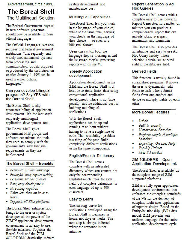 Image may be subject to copyright I had just stepped up to the lectern and was getting ready to address the Court when a group of school children on a field trip were ushered in by their teacher. If anything, they would learn a valuable lesson about getting justice in Canada that day. I had fifteen minutes to convince the Supreme Court of Canada to grant me leave to appeal the judgement of the Federal Court of Appeal. Even if I had been given more time, I did not want to repeat the mistake I had made in Federal Court by telling the whole story. I again prepared my arguments after reading old Memorandums of Points of Arguments given to me by the always helpful Court staff. ***** During the two years it took to appeal my firing all the way to the Supreme Court of Canada, using leading edge Canadian software I built a computer application that I would use as my calling card to find work despite the Appraisal from Hell. It was not quite ready when my appeal to the Supreme Court of Canada was dismissed, not on its merit, but because, in the words of The Right Honourable Chief Justice Brian Dickson, it was “not a question of national interest.” A few days after The Right Honourable Chief Justice Brian Dickson said those discouraging words and invited me to leave his courtroom, I received word that someone wanted to offer me a job. André’s small Montréal-based computer consulting firm had won an impressive contract to provide user support to the Canadian International Development Agency (CIDA), and he was looking for someone to manage the young people he would be sending to Ottawa. I took the job. Sharing a drink at a bar during one of his visits to Ottawa I told André that I had inadvertently found out who he bribed at CIDA and at the then Department of Supply and Services to obtain the contract. He was candid about it. He knew whoever he hired to manage his operation at CIDA would eventually find out and that is why he hired me. Knowing my history, he was confident that after what they did to me for telling on my bosses I would not make that same mistake again, and he was right. And that is how corruption becomes endemic (see Chapter “CIDA,” Shooting the Messenger, Boreal Books). We parted on good terms; after all, he had saved my marriage and possibly my life when he offered me a job. THE SHELL TO THE RESCUE The Boreal Shell was now ready for prime time: