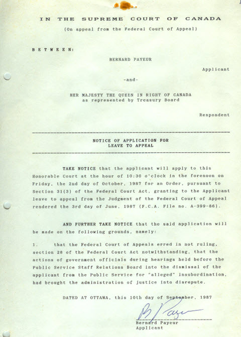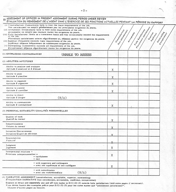 In my twelve years as a public servant, I had never received an appraisal that had rated me less than fully satisfactory, if not higher. This hateful appraisal was nothing less than character assassination. Director General Dan Bresnahan—the leader of, for lack of a more appropriate label, what I refer to as the character assassins—had told Chrétien, during the ambassador's investigation into my allegations, that a Special Appraisal—with which both his Directors, Gordon and Dunseath, had agreed—was being prepared that would rate me "unsatisfactory on all rating factors." The ambassador was obviously okay with that, his affirmations about my character during our previous meeting notwithstanding. I sat across from Richard reading what the character assassins had to say about me. Richard was not smiling; he was serious. He did not say a word, letting the implication of what they intended to do sink in. Richard: "Are you going to sign it?" "No." Richard: "It will go on your file anyway, and you know what that means." If it went on my file, I would effectively become unemployable in both the public and private sectors. That appraisal would be available to any prospective employer. Such an appraisal was also grounds for immediate dismissal or, at the very least, a trip to the psychiatrist. They had decided the less risky route for my dismissal was insubordination; they had no intention of using The Appraisal from Hell to seek my dismissal on grounds of incompetence or mental defect. We both knew that my dismissal, which was imminent, was going to end up before the courts, something they wanted to avoid. Richard: "Look, you agree to leave and I tear it up. We forget the whole thing. What will it be?" What Richard, Gordon and company saw as an incentive to leave, I saw as incentive to stand my ground. If that appraisal went on file, it would be proof positive in any court proceeding of Foreign Affairs' deceitful, duplicitous conduct, or so I thought. I did not sign it. The Personnel Bureau gave its blessing anyway; the report went in my personnel file and I was given a copy. For a government official to destroy an employee’s reputation using this type of appraisal—Barth’s quotation notwithstanding—is not an easy task. That is, unless the assassins can count on the acquiescence of those whose responsibility it is to stop these bloodless, surreptitious murders. At Foreign Affairs, that collective responsibility was shouldered by R. G. Woolham, Director General of the Personnel Administration Bureau. The personnel administration I knew when I was a manager would never have signed off on such an obvious travesty; either the employee had completely lost his mind or his bosses had gone mad. This gave me hope. The Appraisal from Hell was unassailable proof of the gangster mentality at Foreign Affairs. All I had to do was hang in there until my objections to this despicable assessment of a man's character and abilities reached a level where competent and ethical people in positions of authority could be found. IN THE SUPREME COURT OF CANADA (Abbreviated from Shooting the Messenger, Boreal Books)